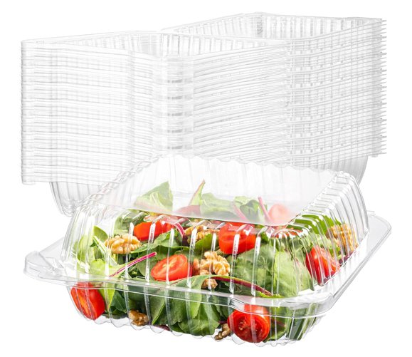 - Size: 8″ x 8″ x 2″ shallow square clear hinged container for light meals and desserts