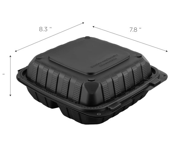 - Size: 8 3/8″ x 7 7/8″ x 3 1/4″ rectangular 3-compartment foam container for full meal portions