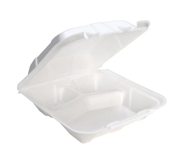 This FP 2230 foam hinged lid container is a practical solution for serving and packing meals. It features three compartments that help keep different food items separated, making it ideal for meals with a main dish and sides. The attached lid closes securely to help prevent spills and keep food safe during transport. Made from strong foam material, it helps keep hot food warm and cold food fresh for longer.