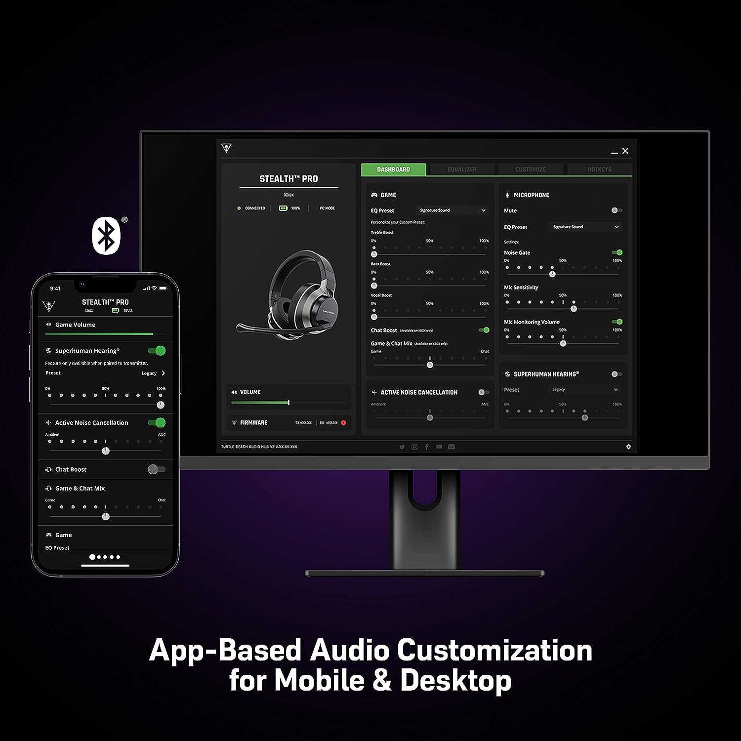 • App-Based Audio Customization for Mobile & Desktop: Use the Turtle Beach Audio Hub App for iOS & Android devices, or Turtle Beach Audio Hub V2 for Windows PCs & Mac to adjust EQ settings, set the levels of noise cancellation, program the mappable wheel, and assign hot keys on PC & Mac. Plus, unlike competitive headsets, you can tune the audio & microphone performance of Stealth Pro directly from the mobile app for any platform you’re playing on.