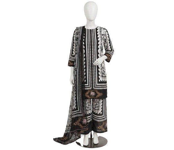 This elegant Pakistani 3-piece suit features a sophisticated black and white printed design with intricate patterns that create a refined and modern ethnic look. The outfit includes a straight-cut kurti, matching trousers, and a coordinated dupatta, making it a complete and versatile set.